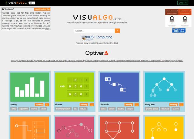 VisuAlgo是一个免费的在线学习算法和数据结构的网站。网站提供了大量的算法和数据结构,包括排序、查找、图论、树、堆、哈希表等。每个算法和数据结构都有对应的可视化演示,用户可以通过演示来理解算法和数据结构的原理和操作。
