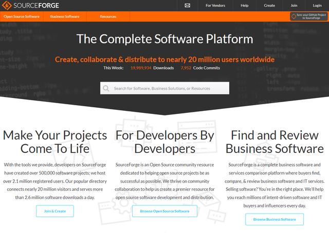 SourceForge 是全球最大的开放源代码软件开发平台和仓库。它集成了很多开放源代码应用程序,包括各种操作系统、编程语言、框架、工具、应用程序等。