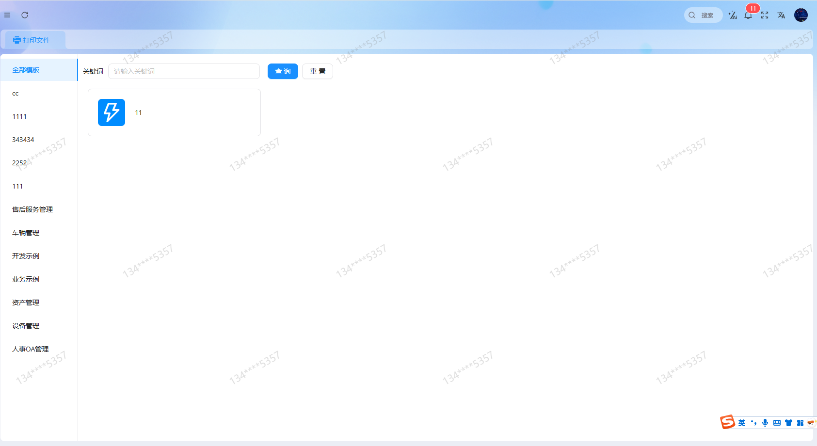 “打印文件”模块仅展示当前登录用户有权限的模板,比如“售后服务管理”“人事OA管理”等模板,无权限的模板不会在列表中显示(权限配置需在后台“打印设计”模块完成)。