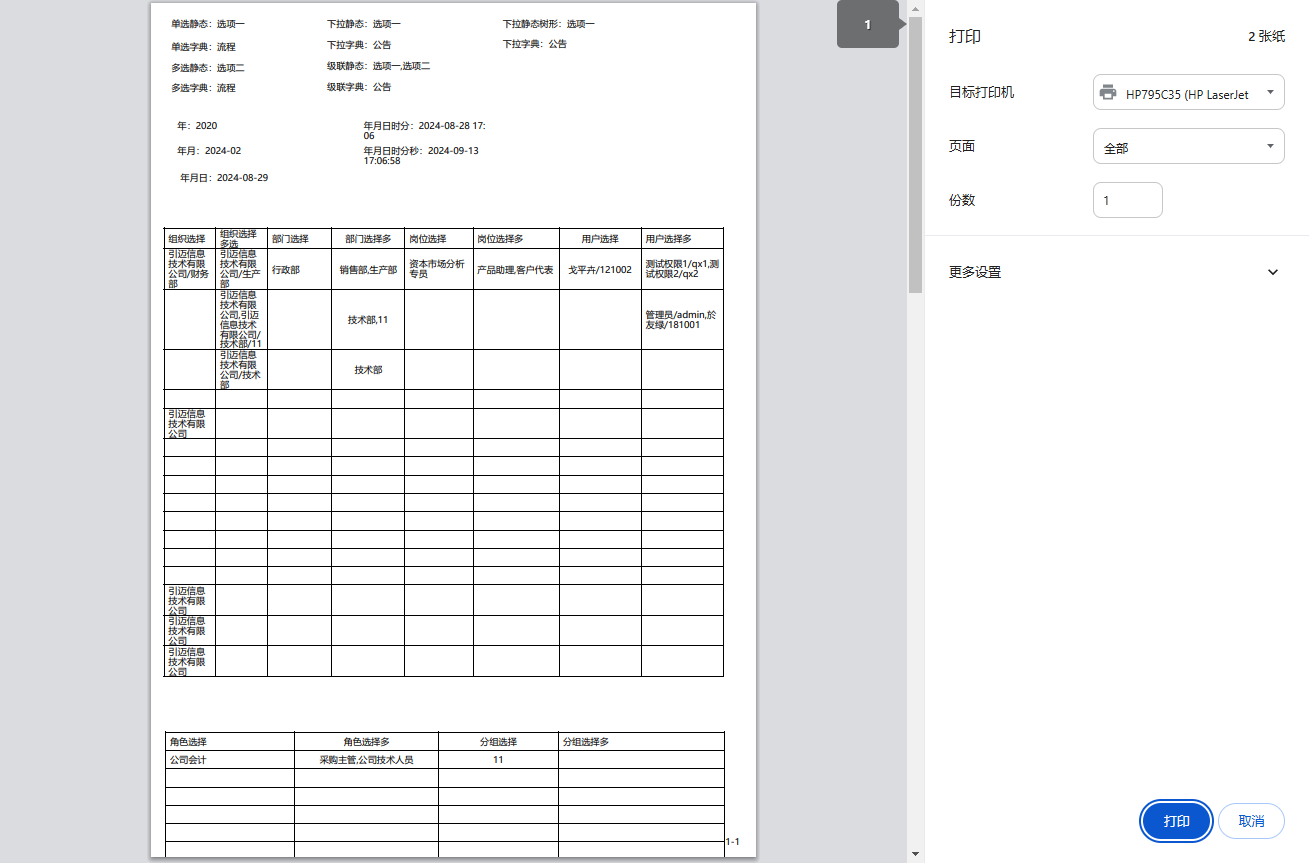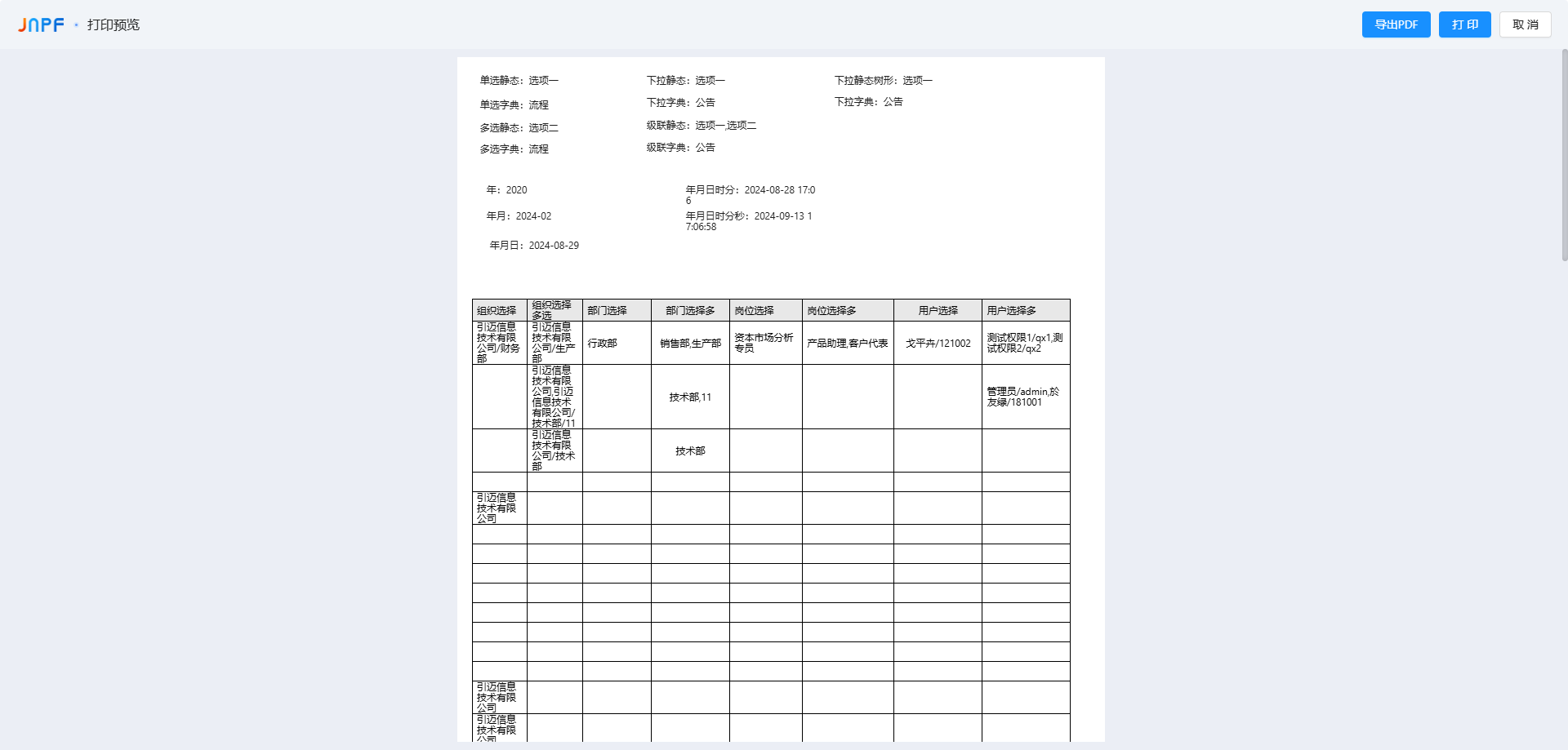 预览界面会完整还原模板设计样式,包括静态选项(如单选静态、下拉静态)、字典数据(如下拉字典、级联字典)和动态字段(如年月日、组织选择),方便确认内容是否符合需求。