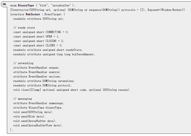 WebSocket API[3], 也称为WebSocket接口(Interface),定义了Web应用和服务器进行双向通信的公共接口。 如下图所示:
