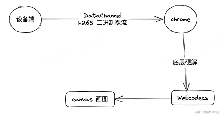 思路: DataChannel 传输 H.265 裸流 + Webcodecs 解码 + Canvas 渲染。即 WebRTC 的音视频传输通道(PeerConnection) 不支持 H.265 编码格式,但可采用其数据通道(DataChannel)来传输 H.265数据,前端收到后使用 Wecodecs 解码、Canvas 渲染。