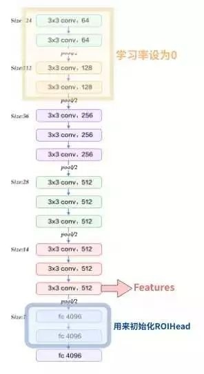 的尺寸就是 C×(H/16)×(W/16)。VGG最后的三层全连接层的前两层,一般用来初始化 RoIHead的部分参数,这个我们稍后再讲。总之,一张图片,经过 extractor之后,会得到一个 C×(H/16)×(W/16)的 feature map。