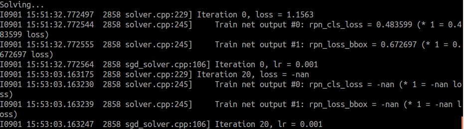 解决方法:把/home/wjx/py-faster-rcnn/models/pascal_voc/ZF/faster_rcnn_alt_opt文件夹下将四个solver文件里面的base_lr由0.001调小一点,调节成0.0001后开始训练,不会出现上面的问题。参考:http://blog.csdn.net/kuaitoukid/article/details/42120961