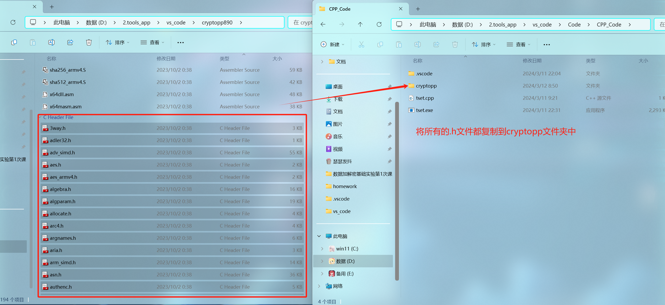 7、在之前环境搭建时所建立的 CPP_Code 文件夹下建立一个名为 cryptopp 的文件夹,在挑出 cryptopp890 文件夹中所有 .h 文件后缀的文件到 cryptopp 文件夹中(可以利用右键的分类来快速筛选出所有.h 文件)