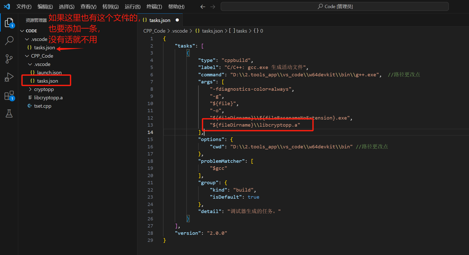 9、在 vs_code 中打开Code 文件夹,并在 task.json 文件中添加"${fileDirname}\\libcryptopp.a"的代码