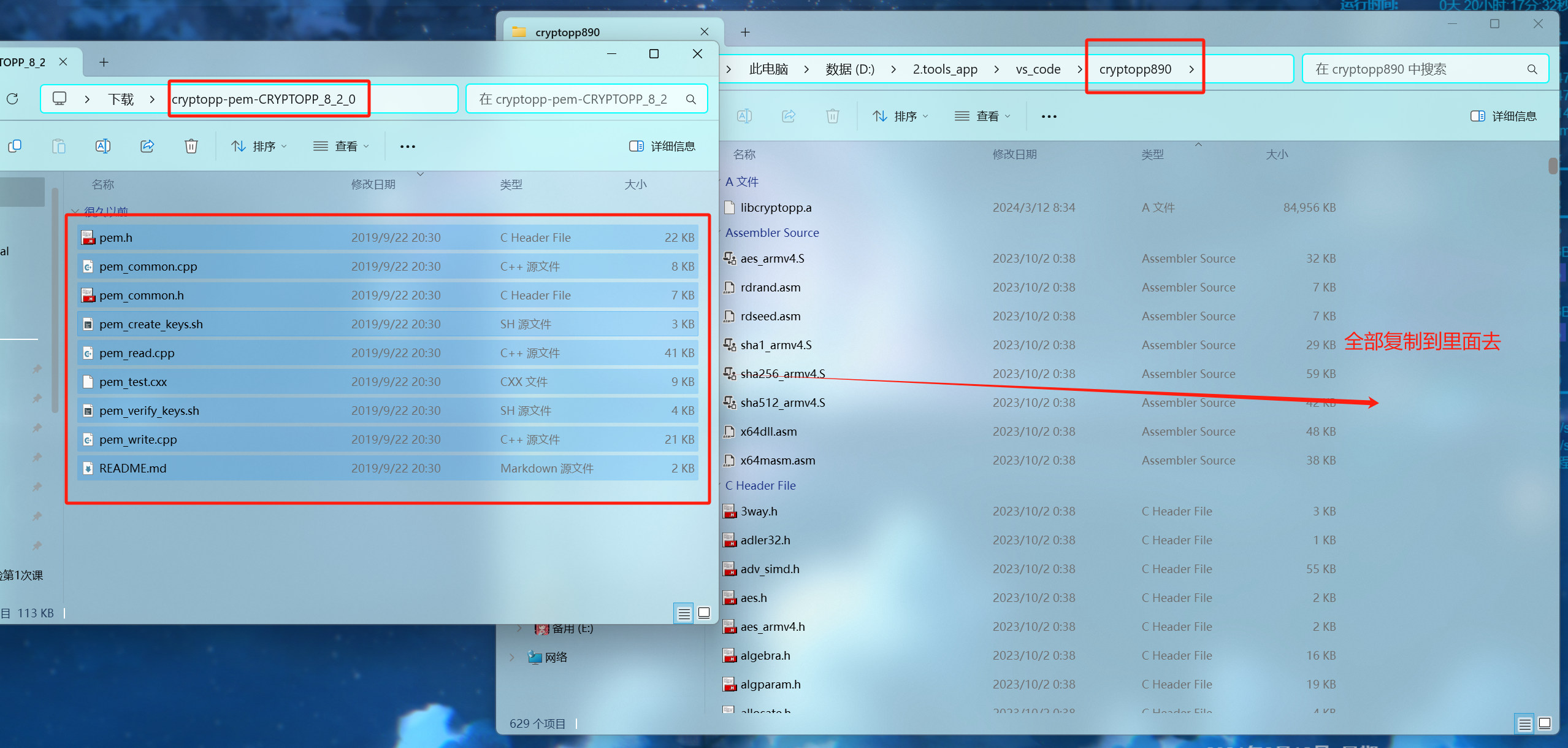 5、解压缩后将里面的文件全部复制到 cryptopp890 的文件夹中