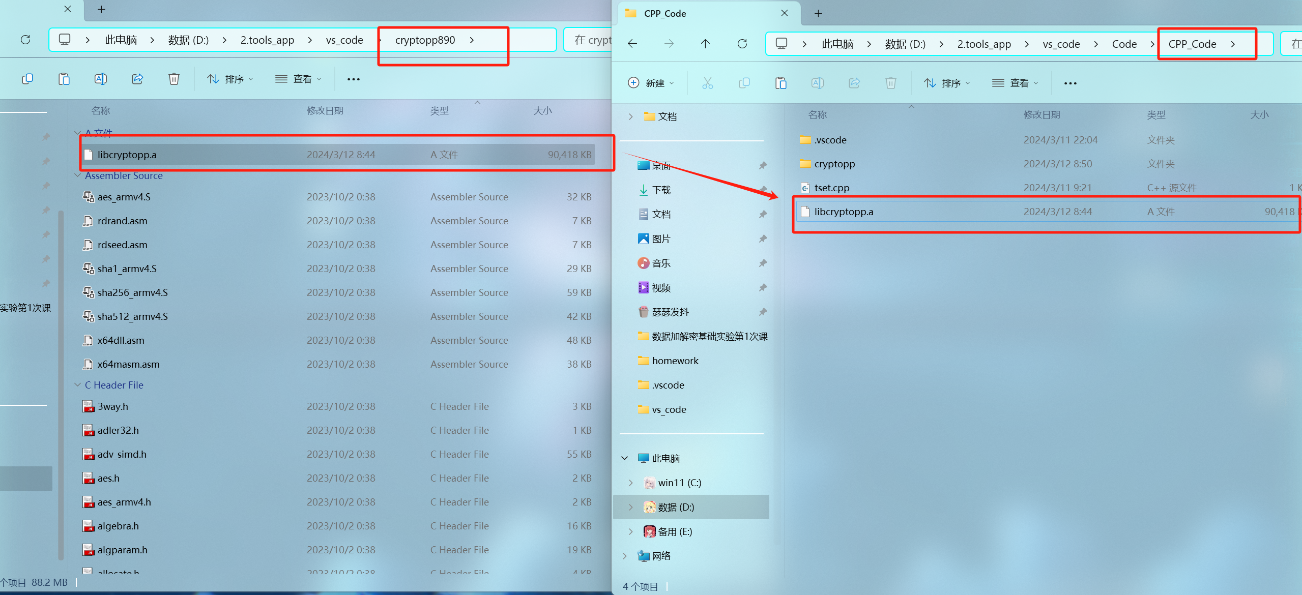 8、把 cryptopp890 文件夹中的 libcryptopp.a 文件复制到 CPP_Code 文件夹中