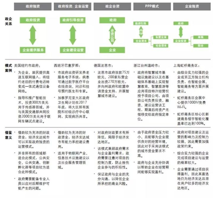 智能城市建设五大运营模式均存在其典型案例, 这些案例将为参与方日后的建设与运营提供借鉴意义。