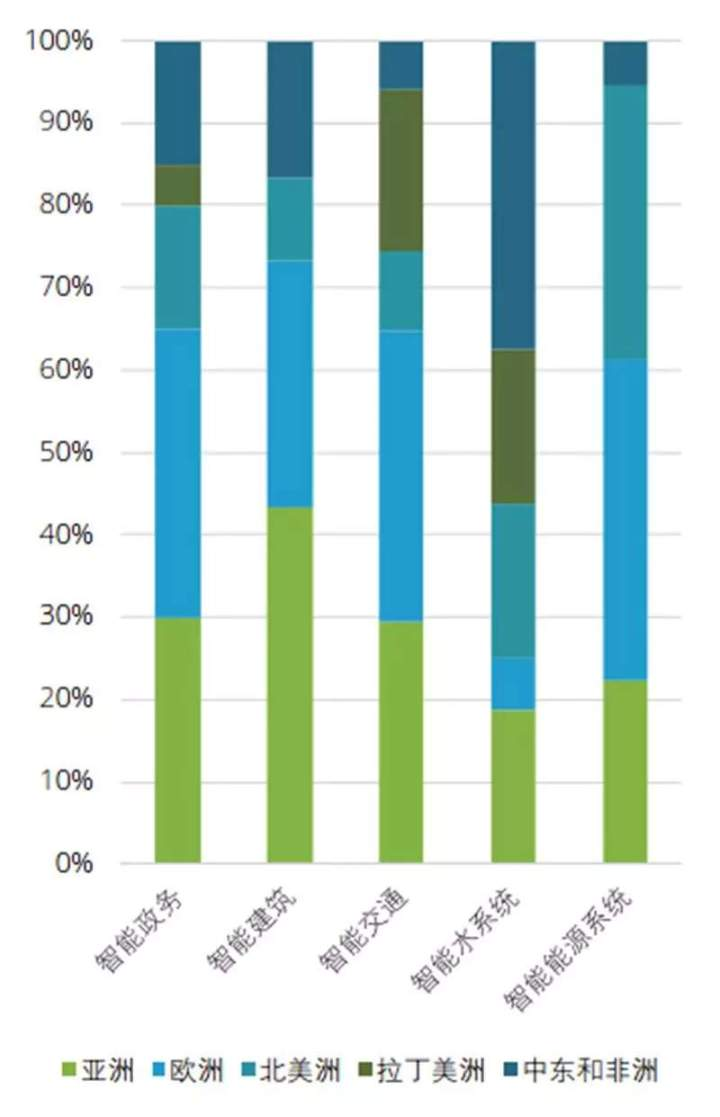 ▲全球各地区在建智慧城市项目比例