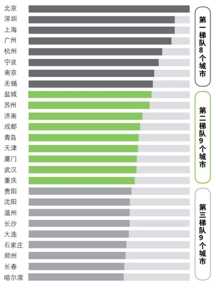 核心的战略层面:城市整体在线政府服务得到改善, 第一梯队城市不仅规划完善, 且政策执行和资金支持均比较到位, 第二梯队城市规划相对比较完善但执行力尚待提高, 第三梯队城市缺少长期和完善的城市规划。