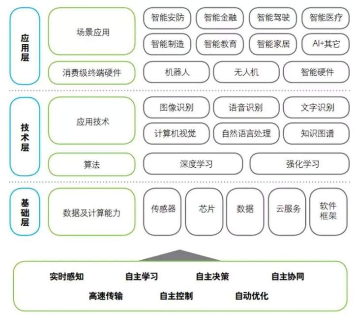 人工智能城市产业链包括基础层加上核心技术层, 然后再加上垂直应用。垂直领域细分为产品和应用智能系统。实时感知、 高速传输、 自主学习、 自主决策、 自主协同、 自动优化、 自主控制。这七大特征是互相关联缺一不可的, 未来超级智能城市需要完全具备这些特征。