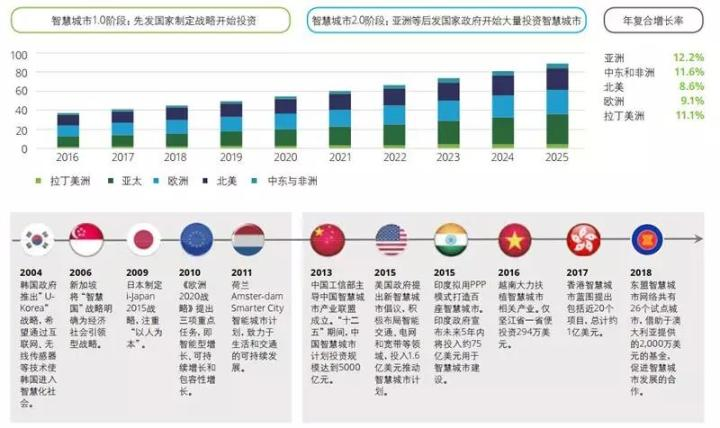 为了应对城市化所带来的挑战, 在过去的十多年里, 各国大力投资建设智慧城市, 投入金额逐年升高, 预计将在未来五年内达到高峰, 由于拥有后发优势和巨大的发展潜力, 亚洲国家和地区在智慧城市建设上有更大的发挥余地。