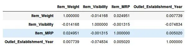 numeric = train[[‘Item_Weight’, ‘Item_Visibility’, ‘Item_MRP’, ‘Outlet_Establishment_Year’]]
