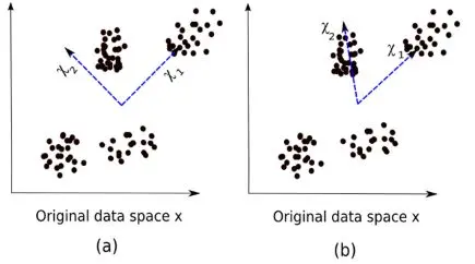 这里我们有类似物体的重量,单位为Kg(X1)和磅(X2)。如果我们使用这两个变量,它们将传达相类似的信息。因此,仅使用一个变量是有意义的。我们可以将数据从2D(X1和X2)转换为1D(Y1),如下所示: