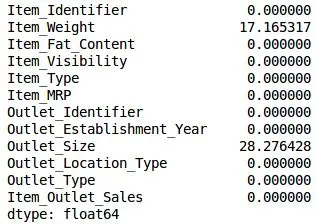 让我们首先使用已知ItemWeight观察值的中值来填充temWeight列中的缺失值。对于OutletSize列,我们将使用已知OutletSize值的模式来填充缺失值: