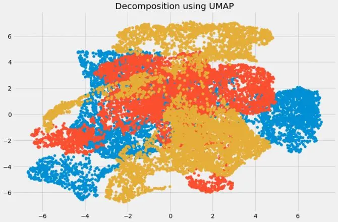 t-SNE在大型数据集上工作表现很好,但它也有它的局限性,例如丢失大型的信息,计算时间慢,无法有意义地表示非常大的数据集。统一流形近似和投影(UMAP)是一种降维技术,与t-SNE相比,可以保留尽可能多的本地数据结构和全局数据结构,并且运行时间更短。听起来很有趣,对吧。