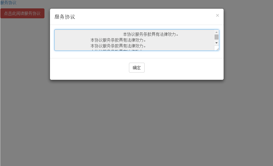 使用弹窗在网页中显示短信息还行,虽然不那么地友好。然而,弹窗对于如同网站服务条款的长信息就无能为力的了。这是需要使用一个叫模态框modal的东西,并且在模态框里面嵌入一个多行文本框textarea。
