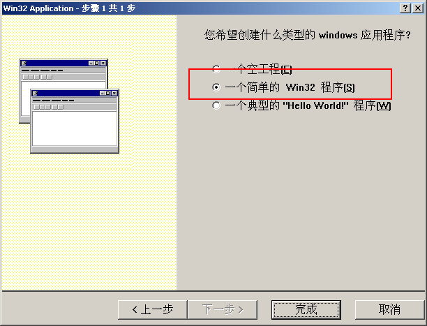 2、接着,弹出一个对话框,不要像写C语言那样直接点“确定”,选择“一个简单的Win32程序”,对,既不是C的一个空工程,也不是直接就选择一个典型的“hello world”程序,放心好了,如果你选择第3个,绝壁是搞半天都搞不懂的
