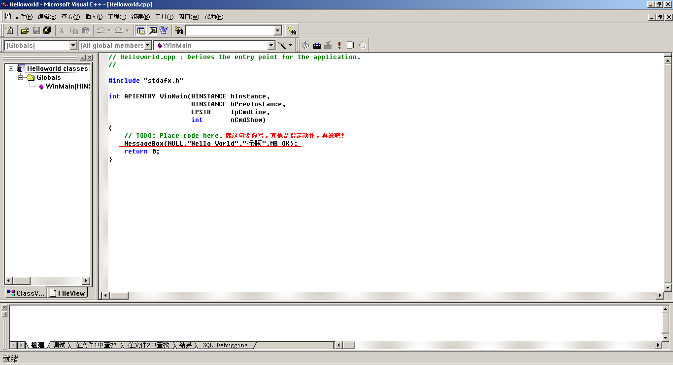 就这么节点,我根本就不想知道那个HINSTANCE是个啥!我也不需要知道,一个简单的HelloWorld就出来了。反正有些学者就喜欢强调各条语句非要弄懂的编程!