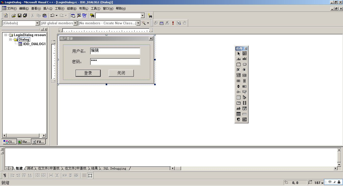 放好两个“用户名”与“密码”的静态文本,把对话框标题改成“用户登录”,并且勾选”居中”属性,让这个对话框一打开就居中,自带的“确定”与“取消”按钮,分别改为“登录”与“关闭”,并利用下方的控件对齐工具把控件的布局放好。