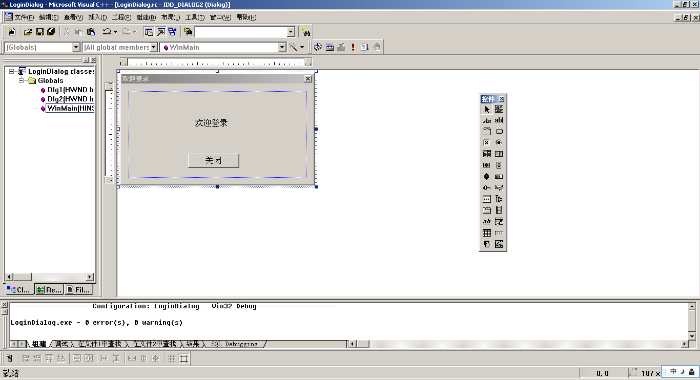 3、在于资源脚本处插入第二个对话框IDD_DIALOG2,改好标题,拖入静态文本,去掉自带的”确定“按钮,把”取消“改为”关闭“,如下图所示,就可以切换WinMain函数处写代码了。