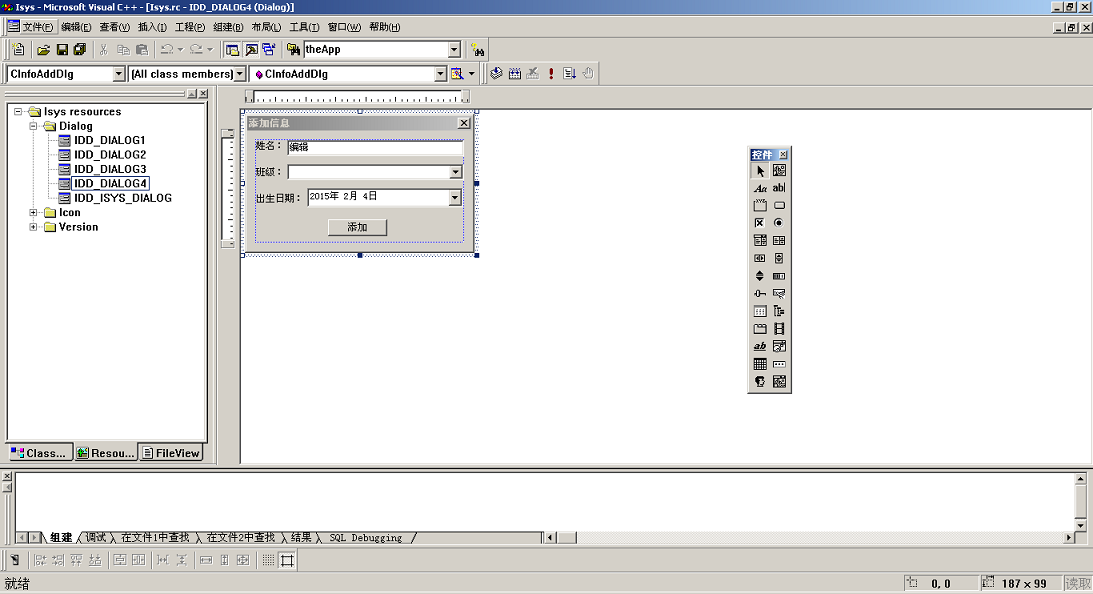 2、之后画出“添加信息”控件,这个对话框里面包含三个静态文本、一个编辑框,一个下拉列表,还有一个日期控件,为这个对话框添加CInfoApp类