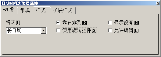 4、把这个日期控件的样式改成如下所示,格式是“长日期”,其他默认就行,你选择“使用旋转控件”也行,个人喜好吧,反正之后的代码没有不同,个人觉得默认的样式比较好看一点。日期控件默认就能够自己输入,也能够自己选择日期。