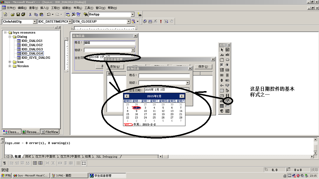 实现下面的功能,学生信息管理,点击添加按钮会弹出一个模态对话框“添加信息”,里面有姓名、班级、出生日期,其中姓名是不允许相同的,然后,在“添加信息”对话框点击“添加”按钮,会把消息插入到“学生信息管理”对话框。“添加信息”对话框里面使用到了编辑框、下拉列表与日期控件,这个日期控件能够自己输入与选择。而在“学生信息管理”对话框,选中信息之后,点击“删除按钮”则能够删除信息。