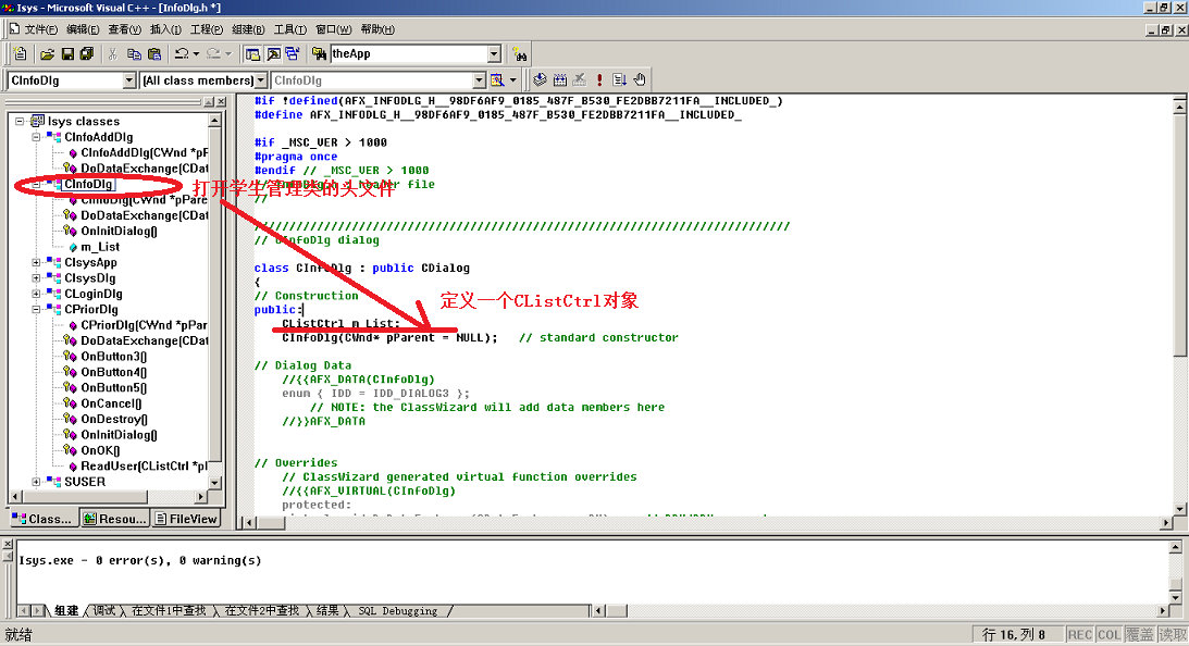 5、之后就开始写代码了,因为我们首先要“学生信息管理”对话框中的列表控件初始化,所以我们要为CInfoDlg添加初始化OnInitDialog()函数,同时我们为了不用每次操作这个列表都要声明一次CListCtrl* plist=(CListCtrl*)GetDlgItem(IDC_LIST1);然后用plist->方法去操作,因此,我们首先如下图在CInfoDlg头文件中加入一个CListCtrl*