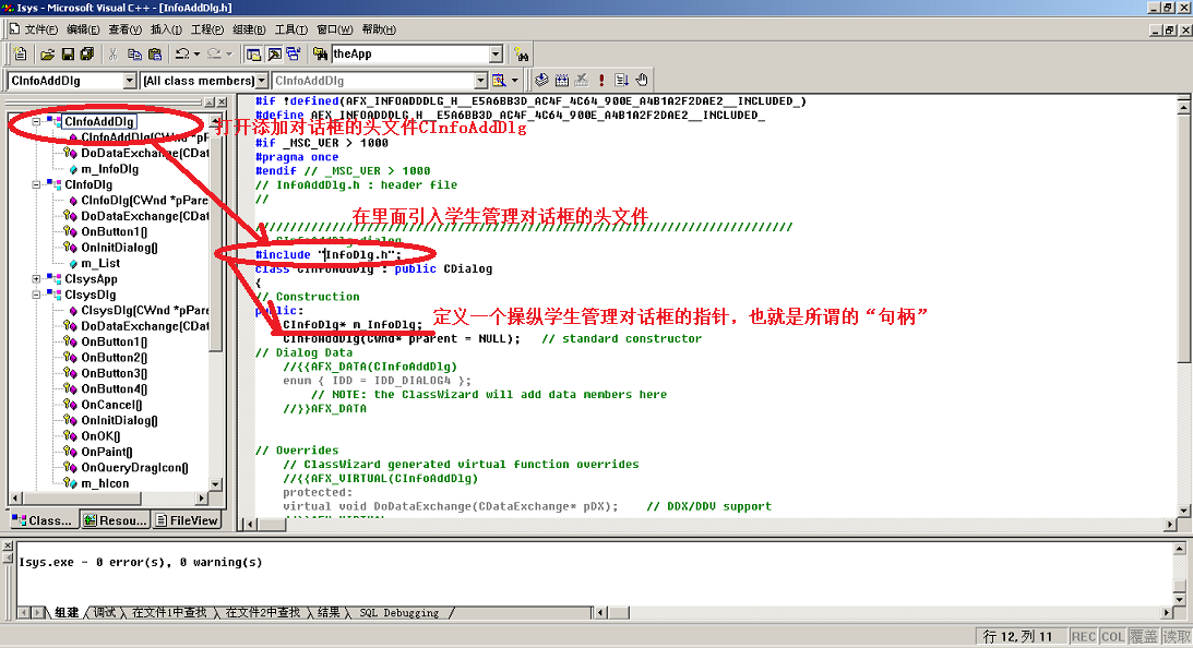 6、之后是“学生信息管理”对话框中的“添加”按钮的消息映射函数,这个按钮是弹出一个CInfoAddDlg的模态框的,为了在“添加”对话框中能够操作“学生信息管理”这个对话框中的控件,我们先要打开CInfoAddDlg.h进行如下图的操作
