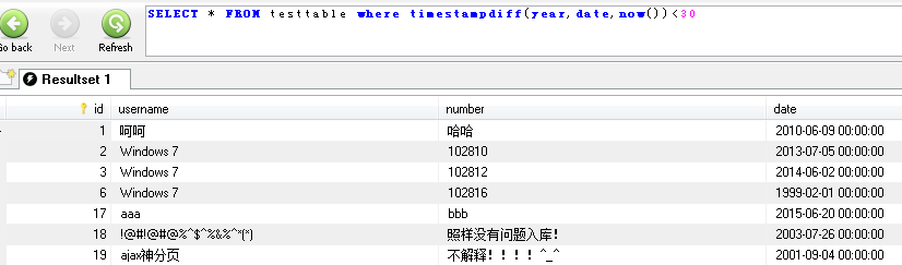 对于一张如下的testtable表,如果要查询date离现在相差的30年的日期