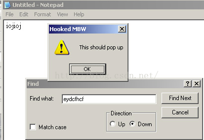 MessageBoxW(NULL, L"This should pop up", L"Hooked MBW", MB_ICONEXCLAMATION);在将原始字节写回内存后调用这个语句。我这里利用NotePad进行测试,当你搜索的文本不存在时,NotePad会弹出一个对话框。现在被注入DLL后的结果是: