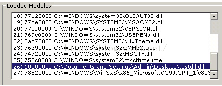 PROCESS_ALL_ACCESS标记是最好的,但它要求将进程的权限修改为SE_DEBUG_ACCESS,限于篇幅,我没有这样做。进程被正确的打开后,通过GetProcAddress获取LoadLibraryA函数的地址。接下来需要在被注入的进程地址空间里,分配一些内存给DLL的路径。这一步做好后,就可以调用WriteProcessMemory将保存DLL的字符串写入到内存中,再然后就是调用CreateRemoteThread,将LoadLibraryA的开始地址和字符串当作参数传递进去。看下图,我们的DLL被目标进程加载起来了。