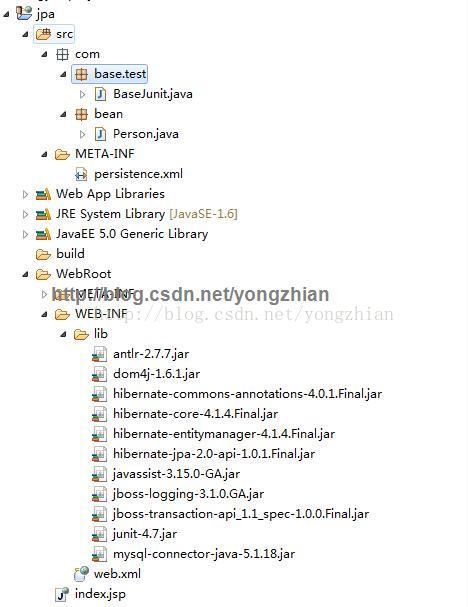 采用RESOURCE_LOCAL管理事务时,要保证数据库支持事务。例如使用MySQL时,需要设置数据库的引擎类型为“InnoDB”,而“MyISAM”类型是不支持事务的。3 /jpa/src/com/base/test/BaseJunit.java
