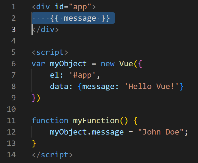 以上Vue示例代码也描述了类似的功能。其中第1~3行是类似HTML的语法,描述一个id为app的div页面元素,其中的{{message}}是数据绑定的语义,在Vue中表示为Template。第6~9行是JS代码,描述了一个Vue对象,对应了上述的app页面元素以及所需的数据变量message的内容信息。第11~13行则是JS函数,它改变message变量的值为"John Doe"。执行这个函数时Vue会自动实现相应的UI界面刷新。