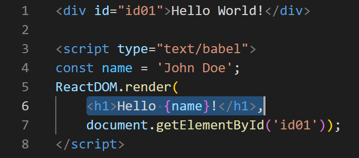 以上代码描述了React如何在指定的页面元素(id为id01的div元素)中改变相应的字符串内容(从"Hello World!"到"Hello John Doe!")。其中第5行的ReactDOM.render()是React JS库提供的一个方法,它可以将相应的内容刷新到指定的HTML元素中。第6行是符合JSX语义的一段代码,它包含了一个类似HTML结构的字符串(<h1>...</h1>),以及一个表达数据绑定语义的字段({name}),会关联到第4行定义的name变量。通过这种方式,JSX把HTML的语义以及数据绑定机制和JS语言结合起来,可以方便地在JS语言中使用。