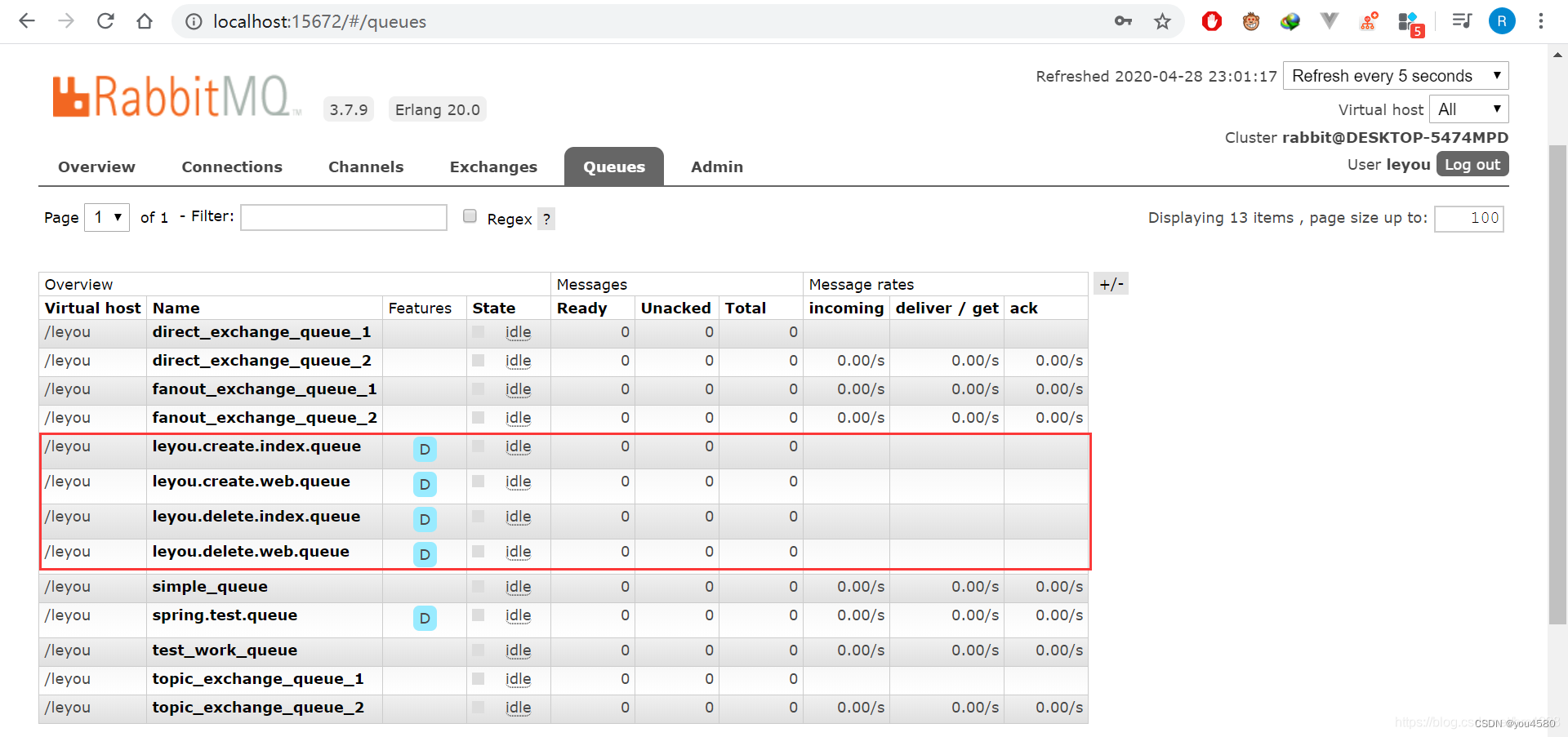 打开 RabbitMQ 管理界面,交换机和队列都已将创建好了