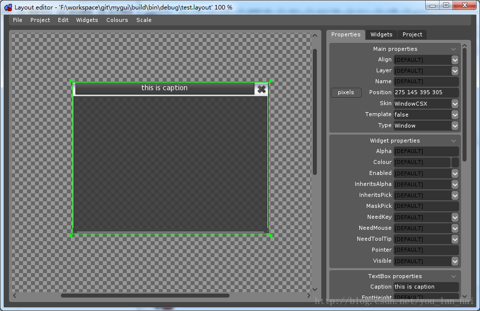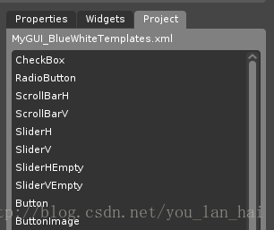 要生成模板很容易,之前没找到方法,以为必须要手写。后来注意到编辑器上有一个project菜单,可以新建project,一个project其实是若干个layout的集合,project中的每个layout都可以当做模板使用。将project存储成*.xml文件,这个xml文件就是我们需要的模板文件。然后在MyGUI_Core.xml中加入project的xml文件,重启编辑器,就可以在使用自己建的模板(皮肤)了。
