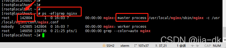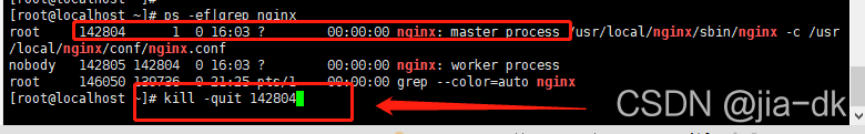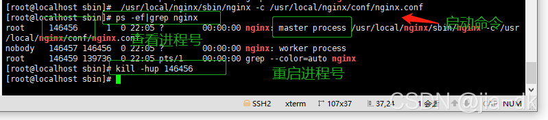 - 方法二:查找当前nginx进程号,然后输入命令:kill -HUP 进程号 实现重启nginx服务