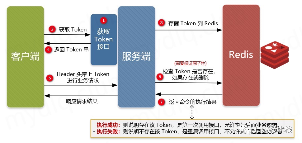 ① 服务端提供获取 Token 的接口,该 Token 可以是一个序列号,也可以是一个分布式 ID 或者 UUID 串。