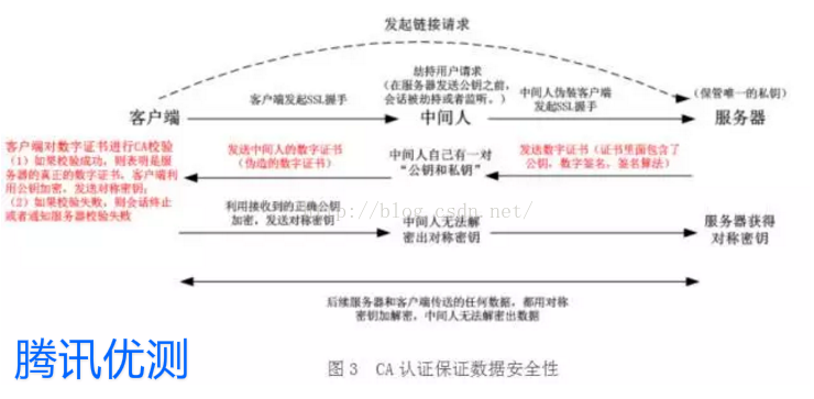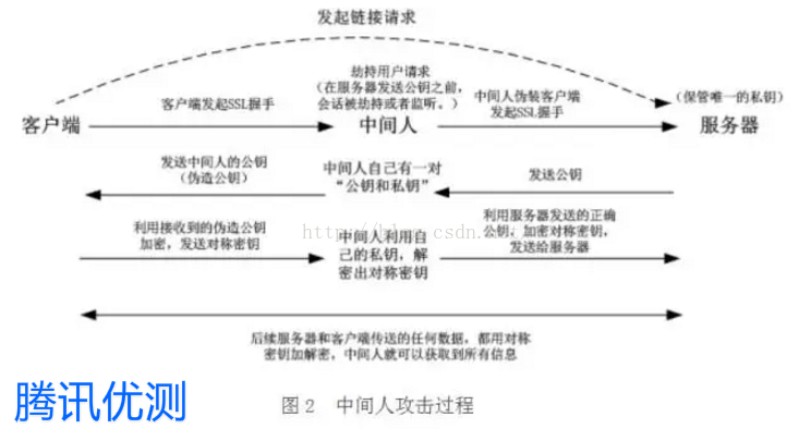 但是这样似乎还不够,如果通信过程中,在三次握手或者客户端发起HTTP请求过程中,客户端的请求被中间人劫持,那么中间人就可以伪装成“假冒客户端”和服务器通信;中间人又可以伪装成“假冒服务器”和客户端通信。接下来,我们详细阐述中间人获取对称密钥的过程: