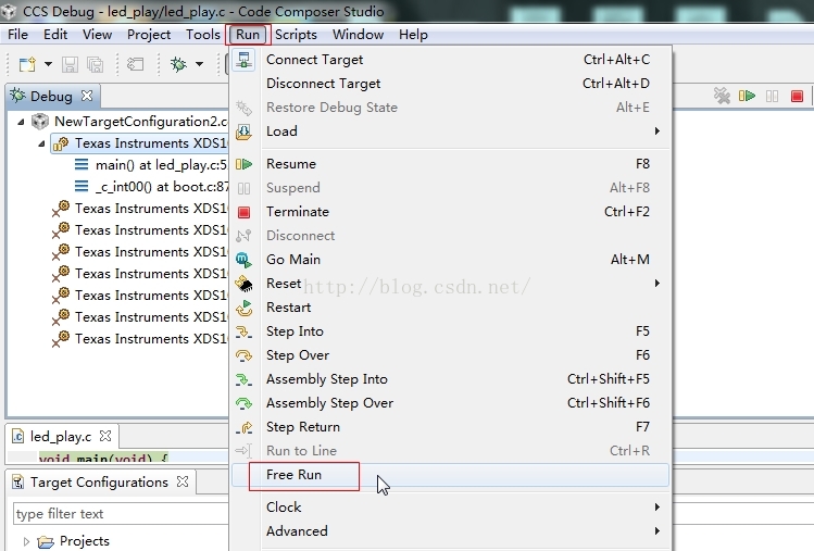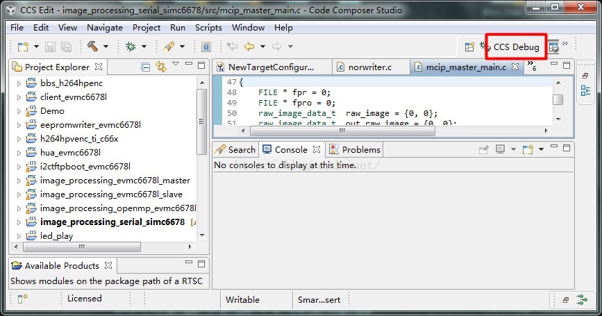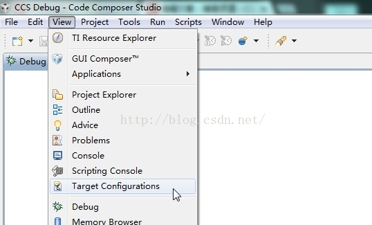 第一步:准备好一个编译好的out文件(LED闪烁demo),连接好硬件卡板上电,如下图打开CCS Debug 窗口。