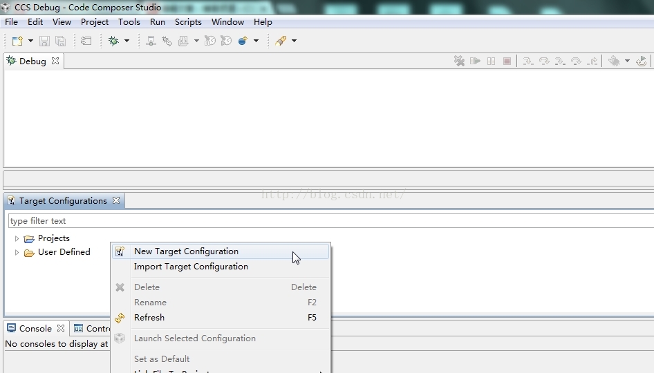 第三步:如下图在新打开的窗口空白处右击选择New Target Configurations选项。目标文件主要规定了硬件的型号和gel文件的位置。