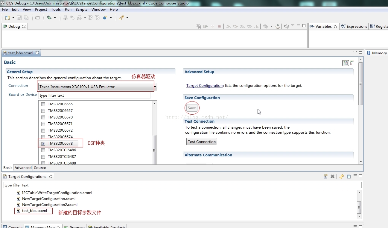 第四步:如下图双击新建好的目标文件,在打开的新窗口中选择合适的仿真器驱动,和DSP类型,然后点击保存。