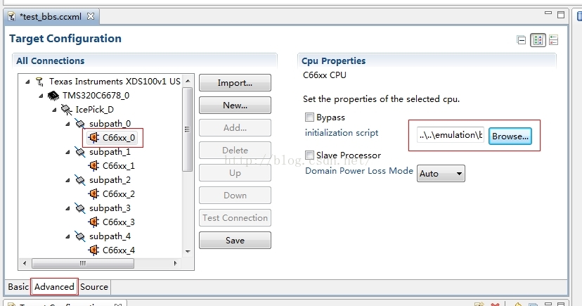 第五步:如下图选择Advanced标签,左击C66xx_0核,在右边为其选择evmc6678l.gel文件,此gei文件位于ccsv5\ccs_base\emulation\boards\evmc6678l\gel文件夹下。