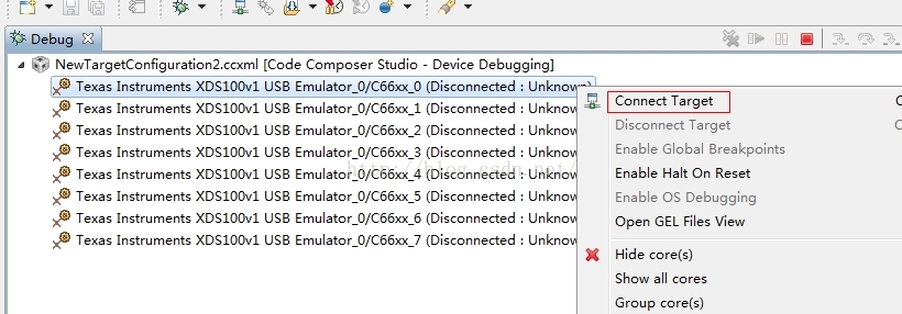 第七步:如下图右击0核,选择连接,ps:如果想一次连接、加载、运行多个核,可以将需要的核都选中右击分组(Group cores)。