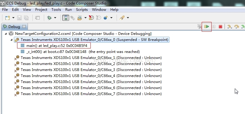 第十步:如下图,out文件加载好后会自动运行到main函数处,点击右边的绿色运行按钮即可在dsp上运行此程序。