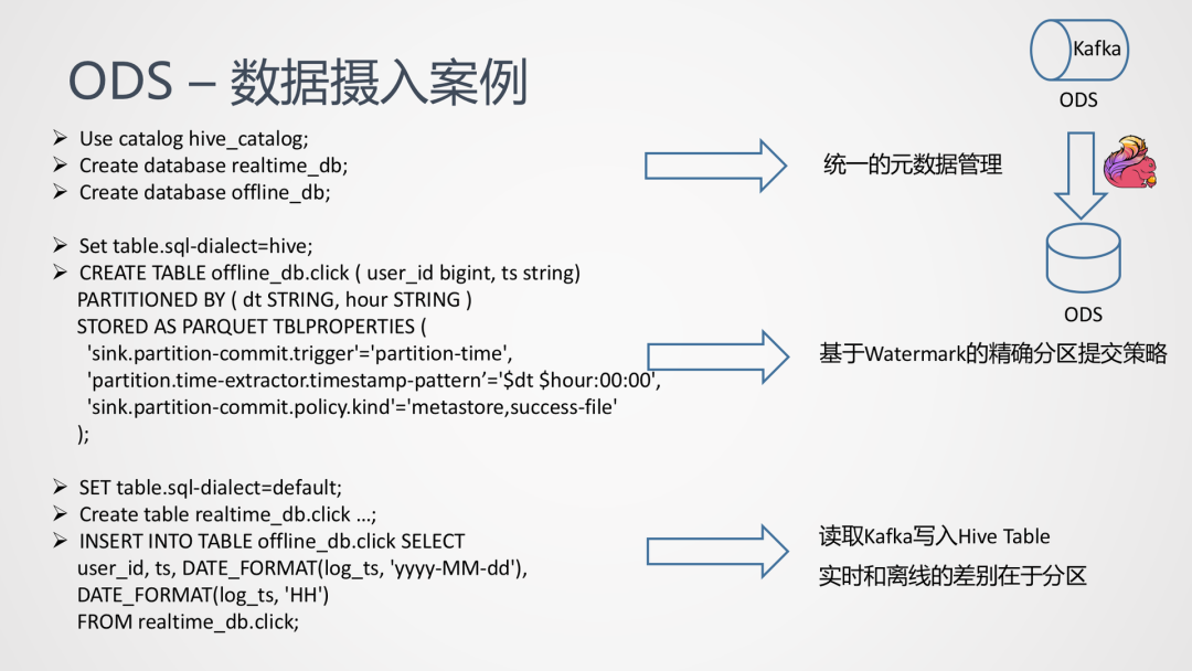 Flink Hive/File Streaming Sink 即为解决这个问题,实时 Kafka 表可以实时的同步到对于的离线表中: