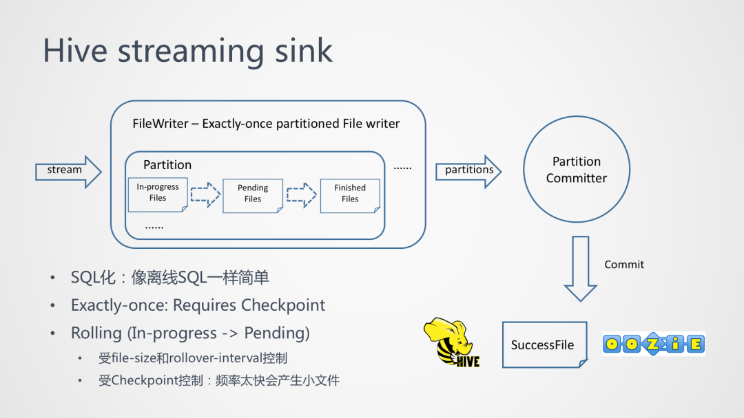 接下来介绍下 Hive/File Streaming Sink,分为两个组件,FileWriter 和 PartitionCommitter: